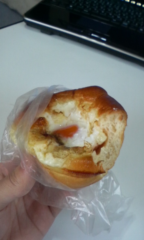 もりもとのパン2。名前は・・・しらん。なんかうまそうで買った。半熟玉子と中にベーコン入ってた。