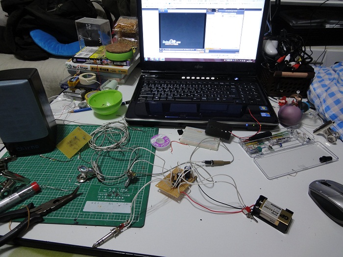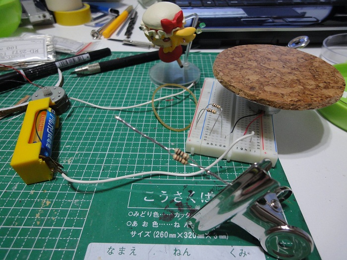 電池は単三電池1個でやりました。抵抗は2時間の奮闘のすえ