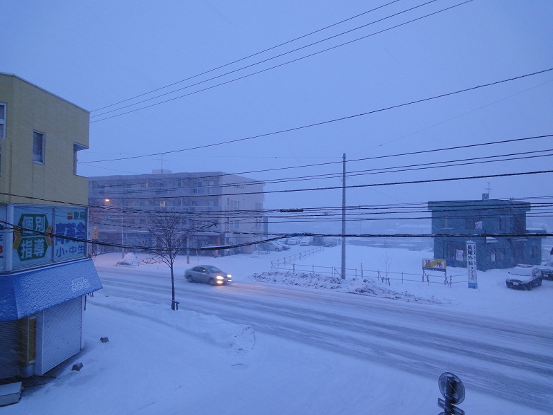 時刻は7時くらい。5分前は朝日できれいだったのに、一気に吹雪ですよ。