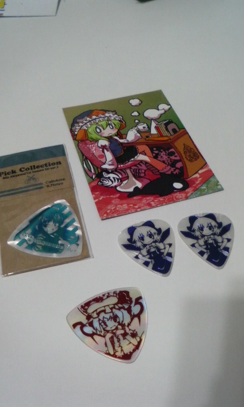 とがさんからのコミケのお土産。ありがとー!ピックだね。あと澪の携帯クリーナーとストラップも