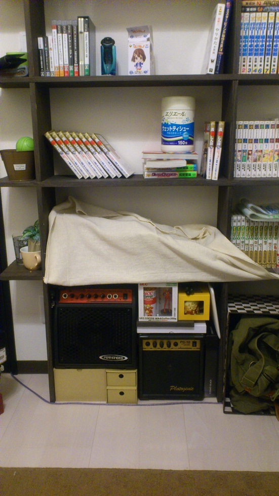 ギターとベースのアンプを本棚に植え込みました。うまい具合入らなかったので半ば強制で。
